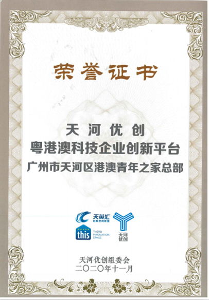 2020年,总部完成了广州市科技企业孵化器登记工作,并积极参与省、市、区有关政策项目申报,为港澳青年创新创业创造更多更有利的条件。9月,总部参与天河区“天河优创粤港澳科技企业创新平台”项目申报,获评“2020天河优创特色榜单——粤港澳科技企业创新平台”称号,并于11月底在2020广州国际创新节上获颁荣誉证书及奖牌。