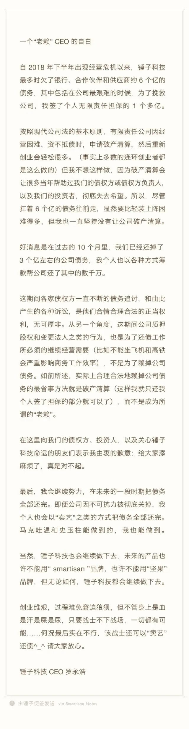 2019年11月,罗永浩以一封“一个老赖CEO的自白”公开信,回应了来自丹阳法院的限制高消费令,以及锤子科技应对经营危机的进展,承认了6个亿的债务。