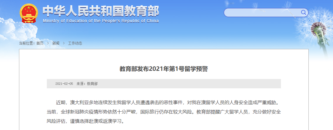 【教育部发布2021年第1号留学预警:谨慎选择赴澳或返澳学习】文中显示,近期,澳大利亚多地连续发生我留学人员遭遇袭击的恶性事件,对我在澳留学人员的人身安全造成严重威胁。详情>>>
