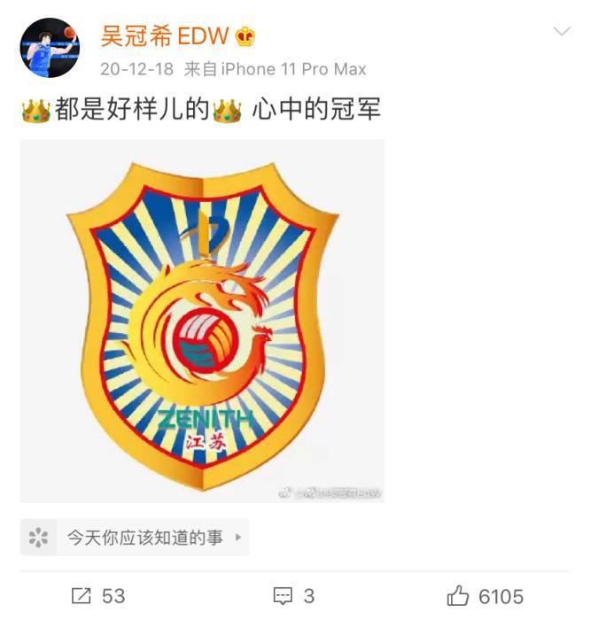 封闭比赛让球员和家人不能见面,但是该秀的恩爱却没落下。去年12月份,女超联赛决赛中,张常宁带领的江苏女排1:2不敌天津女排,错失冠军。身为家属的吴冠希人在诸暨,第一时间隔空送上安慰。