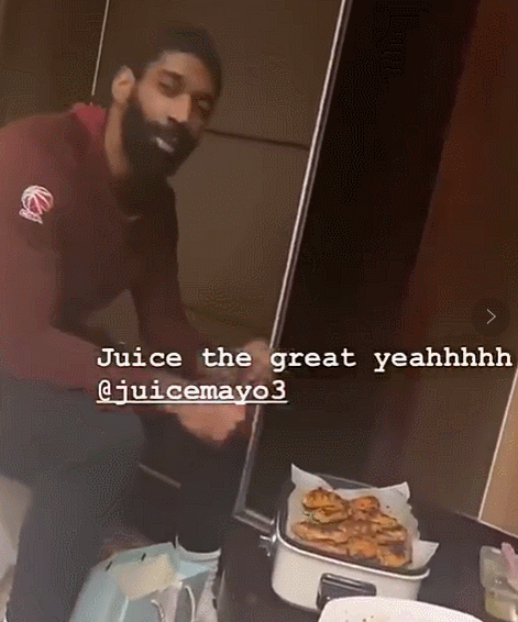 辽宁外援梅奥还化身烧烤小哥,给老大哥哈德森烤起了鸡翅。
