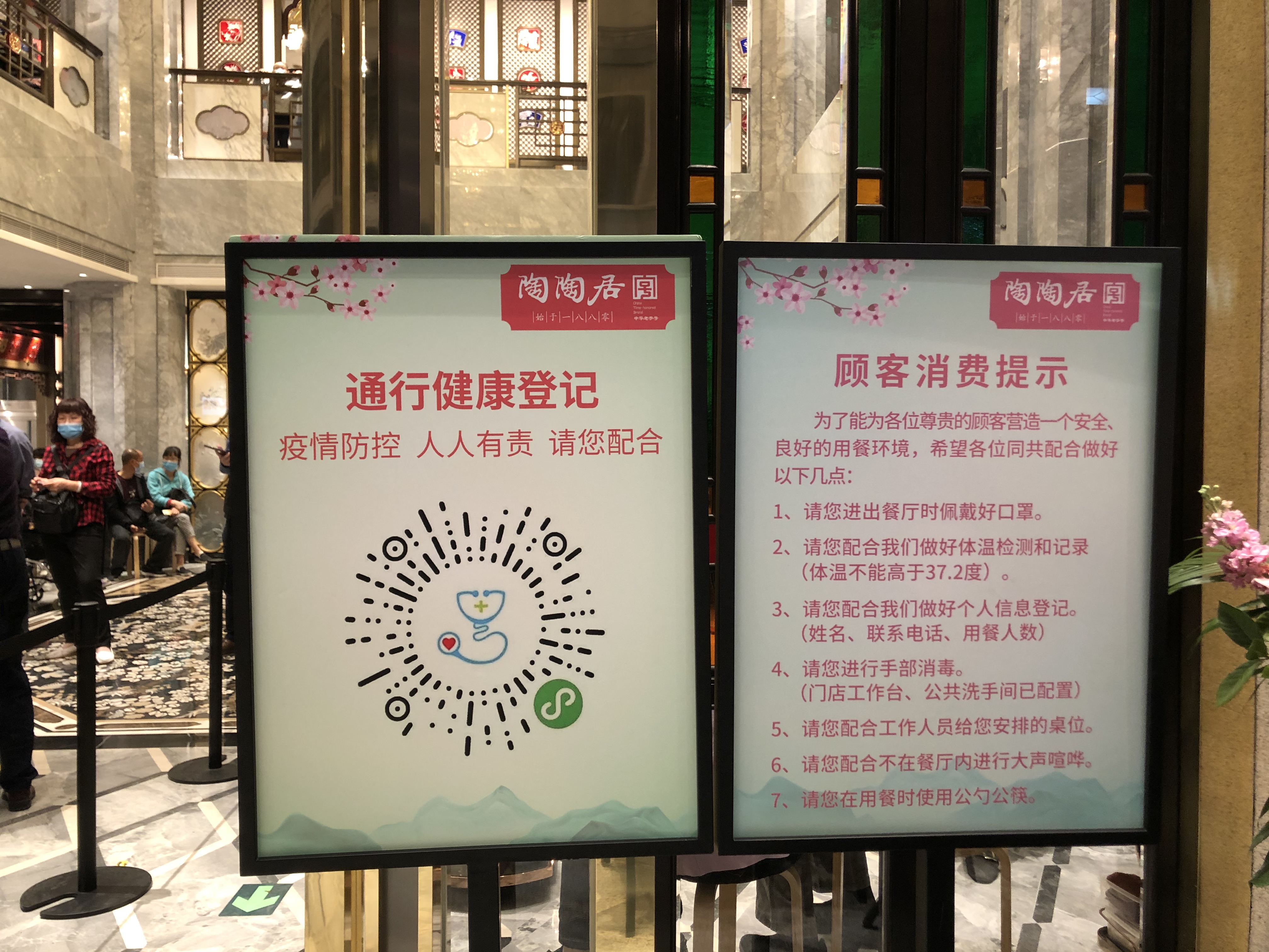 在门店,门口等位区已经增加礼宾栏,食客排队取号,实名登记。餐厅设有专人专职负责测温,对用餐食客体温进行测量登记。凡是入店的食客都被要求佩戴口罩,在门口,也备有免洗消毒液供食客使用。此外,餐厅还增设电子测温仪,下周还将配置测温机器人以精准防疫。