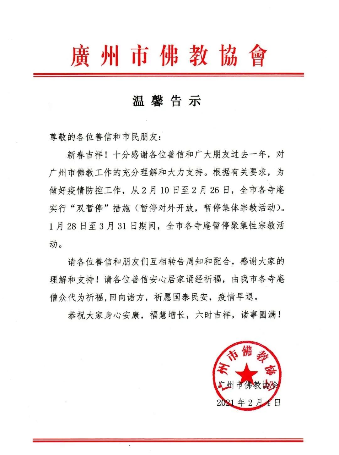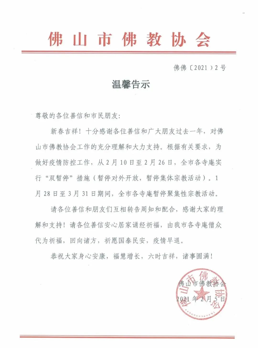 2月5日,佛山市佛教协会发布告示:从2月10日至2月26日,佛山全市各寺庵、各道教场所实行“双暂停”措施(暂停对外开放,暂停集体宗教活动)。