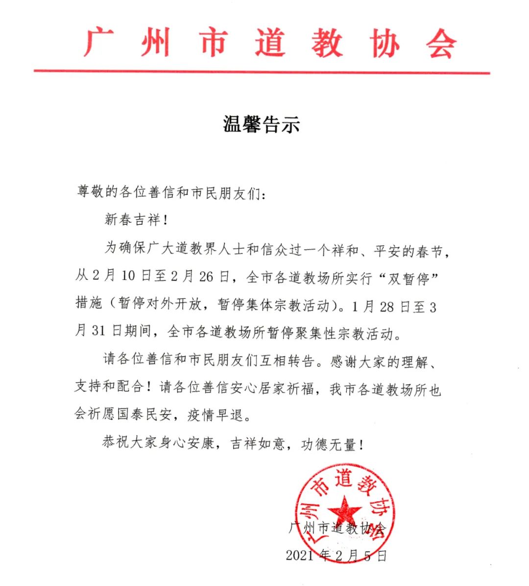 2月5日,广州市佛教协会、道教协会发布告示:为做好疫情防控工作,从2月10日至2月26日,全市各寺庵、各道教场所实行“双暂停”措施(暂停对外开放,暂停集体宗教活动)。1月28日至3月31日期间,全市各寺庵、各道教场所暂停聚集性宗教活动。