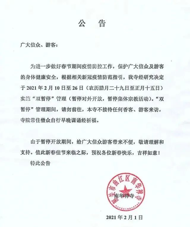 2月5日,韶关市曲江区南华禅寺微信公众号发布公告称,根据相关新冠疫情防范指引,该寺经研究决定于2021年2月10日至26日(农历腊月二十九日至正月十五日)实施“双暂停”管理(暂停对外开放,暂停集体宗教活动)。“双暂停”管理期间,请勿前往,南华禅寺寺不接待任何香客、游客来访,寺院常住僧众自行早晚课诵经。