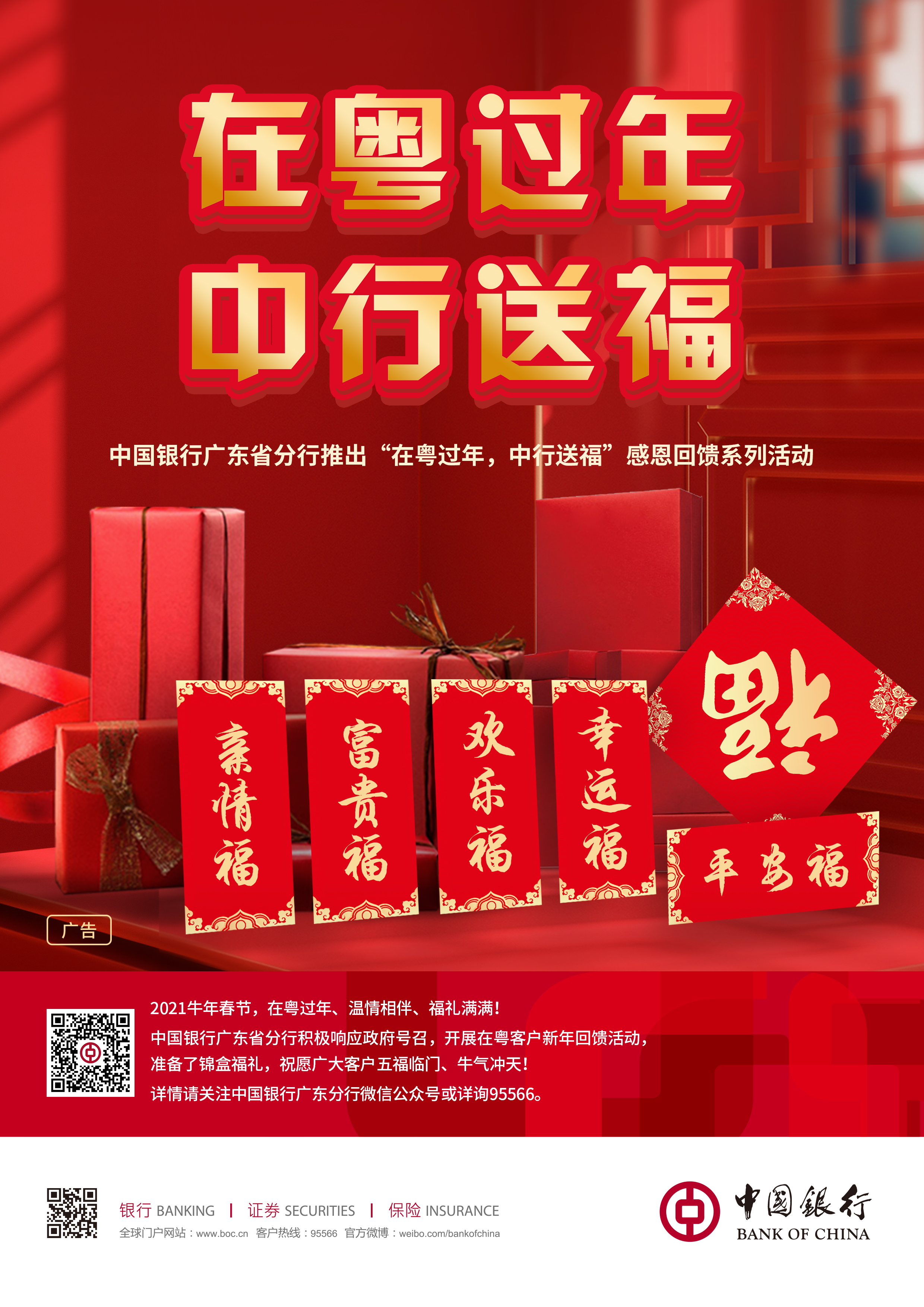 今年,因疫情防控需要,各地纷纷响应国家号召就地过年,非必要不出行。为在特殊时期丰富人们的春节文化生活,提高老百姓的幸福感,中国银行广东省分行推出“在粤过年,中行送福”感恩回馈系列活动以及“惠过年”普惠金融服务方案,以金融力量助力营造欢乐喜庆的节日氛围,让“就地过年”充满年味和人情味。