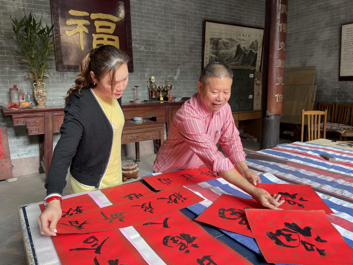 书法爱好者现场挥毫泼墨、笔走龙蛇,一幅幅春联、一张张“福”字现场送给群众。近日,荔湾区冲口街道党工委、办事处组织开展新春楹联主题活动,来自省直属机关老年协会文化艺术交流中心的书法大家、冲口街辖区内中小学的小书法家、招村招氏后人及附近的居民,齐聚聚龙古村,为群众免费书写春联和“福”字,并为附近的独居长者提供上门派送志愿服务,喜迎新春佳节。