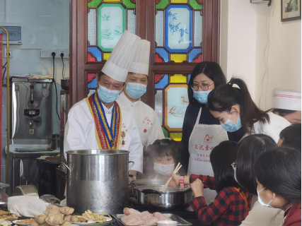 活动邀请了荔湾区白切鸡制作技艺非遗传承人冼伟文大师担任导师。冼师傅介绍了熬制鸡水的材料、鸡种的选择、浸泡鸡身的手法以及所需要注意的事项,详细讲解大家如何制作出一只“皮爽肉滑,骨都有味”的广式白切鸡。在等待浸熟鸡肉的过程中,还教大家制作第二道充满年味的菜肴——广式盆菜,盆菜内有鲍鱼、猪手、冬菇、冬瓜等原材料,一层层叠进大盆之中,加上秘制酱汁加热熬制,寓意着家肥屋润,来年赚得盆满钵满。最后,大家吃上了自己亲手参与制作的美味菜肴。
