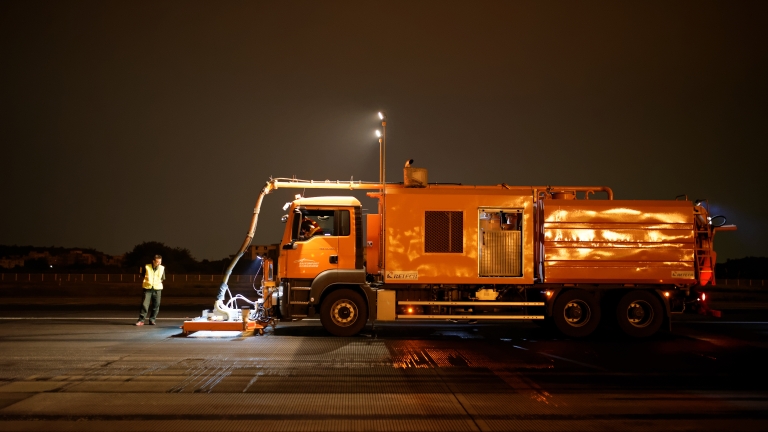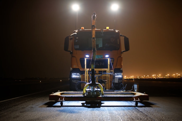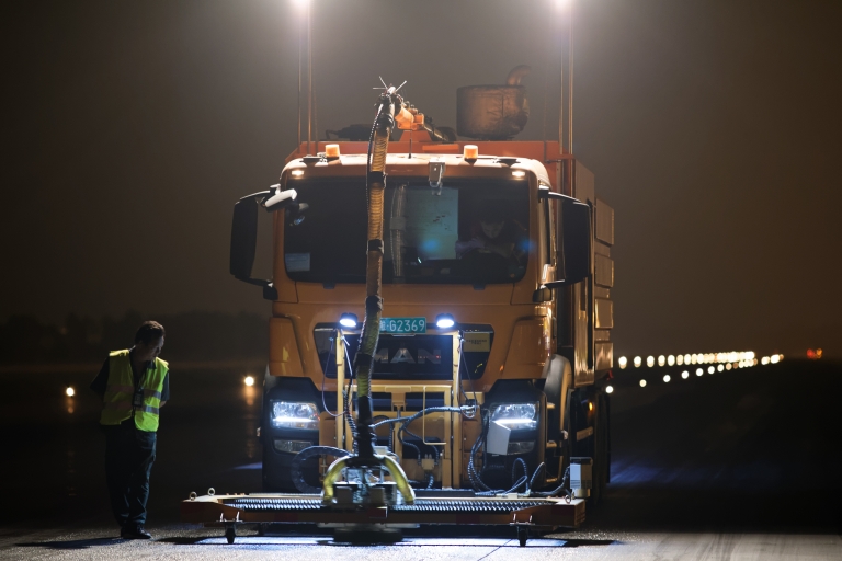 那这样的清洁,跟普通路面清洁一样吗?梁经理说,那可大不一样!跑道除胶是门技术活,既要把胶除干净,又不能伤及道面,所以除胶压力需要精准控制。同时,还要根据跑道摩擦系数测试曲线显示的各区域摩阻性能下降情况不同,动态调整出水压力。难度还在于不能随时除胶,由于白云机场航班起降繁忙,凌晨1:00多仍有较多航班需要使用跑道,早上天蒙蒙亮就又开始保障出港早高峰,只有凌晨2:00-5:00航班相对较少,两条跑道即可保障航空器起降需求,所以这段时间就可以关闭一条跑道来进行除胶作业。