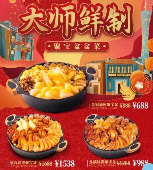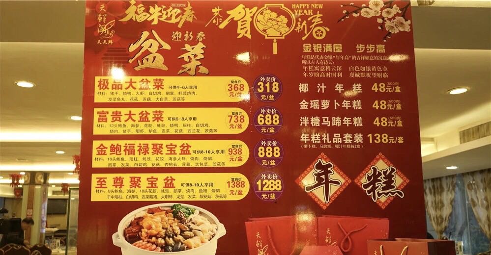 以天鲜阁海鲜酒家下塘店为例,年夜饭大盆菜有极品大盆菜、富贵大盆菜、金鲍福禄聚宝盆和至尊聚宝盆四种选择,其中各类盆菜的外卖价格普遍比堂食价格低50-100元不等。