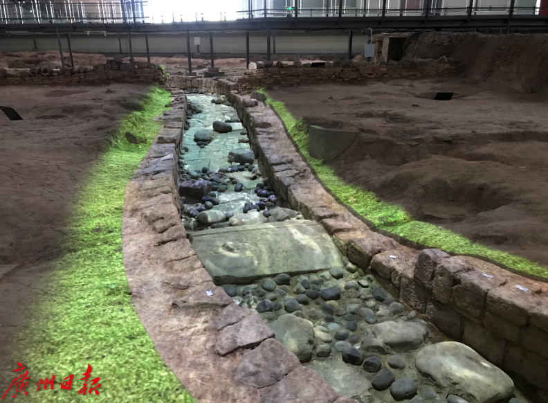 本次通过三维建模仿真等技术勾勒的南越国曲流石渠全貌的流水动态场景,令观众置身其中,仿佛是踏入当年南越王宫苑“茵茵垂柳,曲水流觞”的空间。