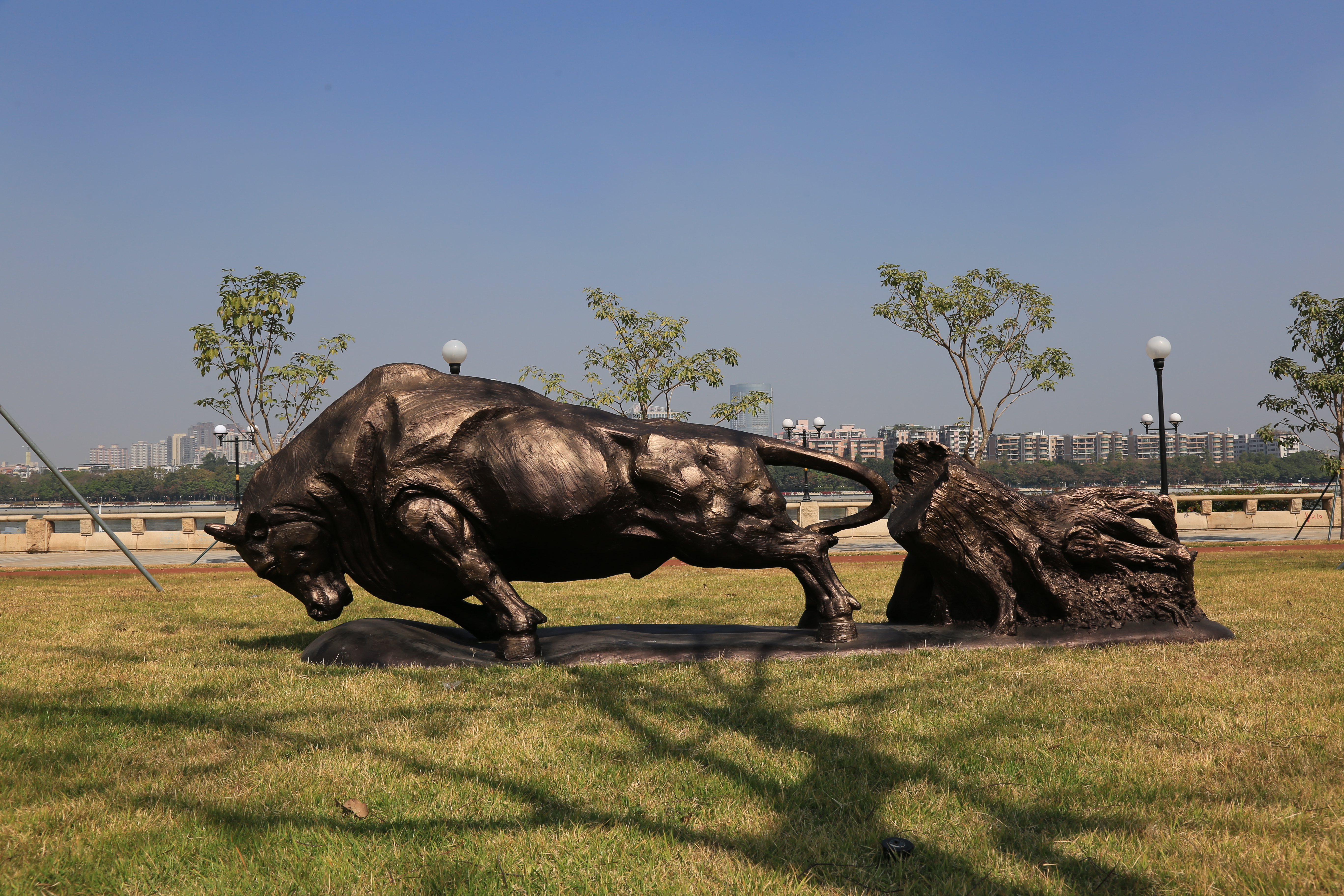 潘鹤于1983年创作的《开荒牛》在立在珠江边的草地上,努力向前却步履艰难的牛正全力拉拔着身后的老树根,整个牛身倾向前,即将迸射出无穷力量。寓意着中国改革开放、开拓创新的精神。