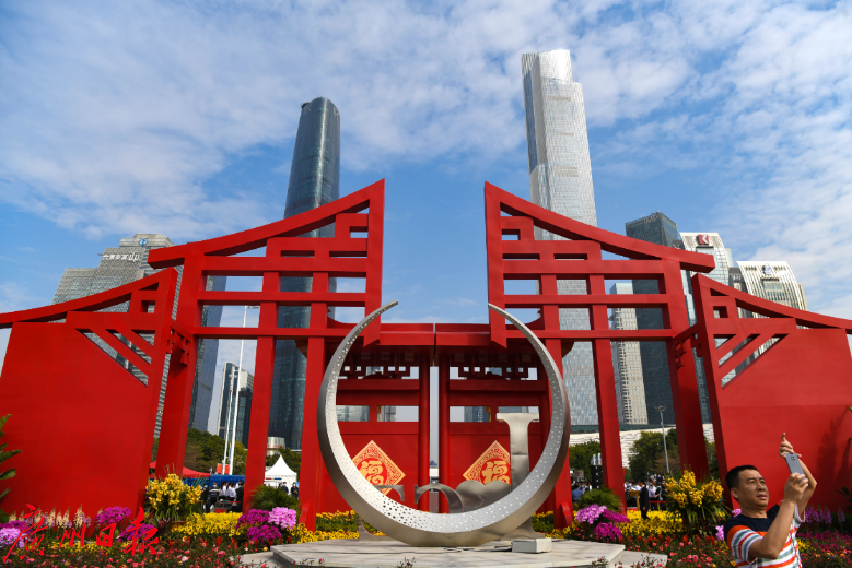 园博会的展览入口也运用传统牌坊、门楼、灯笼等设计元素形成“门”字,对寓意广州的包容与开放。据广州市林业园林局副局长陈迅介绍,中轴景观是“花鸟林自然美集”,以脚手架搭建的巨大同心环运用中国红为主色调,代表着为中国开创美好新天地的中国共产党永葆赤诚的红色基因。