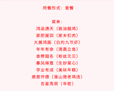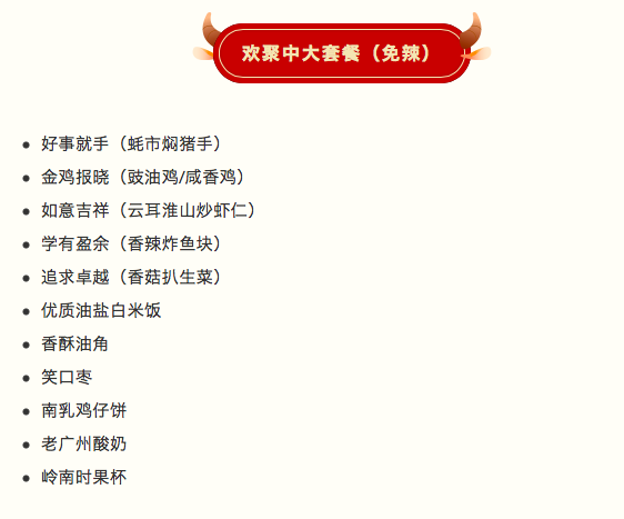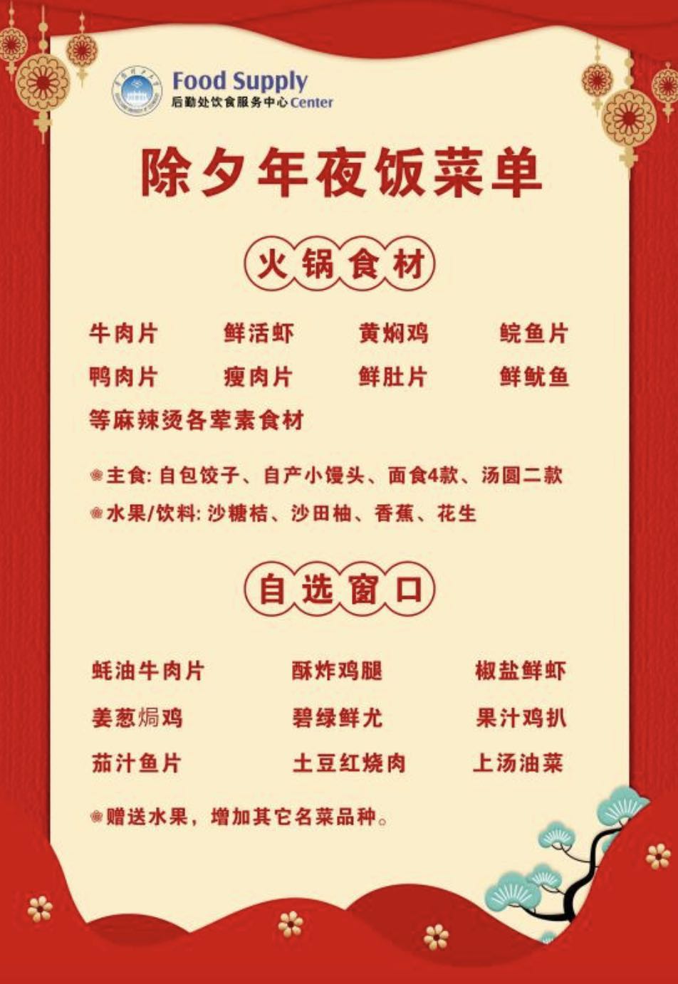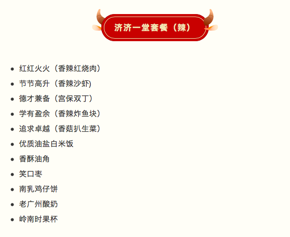 暨南大学推出牛气冲天套餐、节节高升套餐、吉祥如意套餐三大年夜饭套餐,学校学生处为留校学生发放餐票,除夕当晚五点到七点半供餐。春节期间暨大食堂不打烊,正常提供就餐保障。