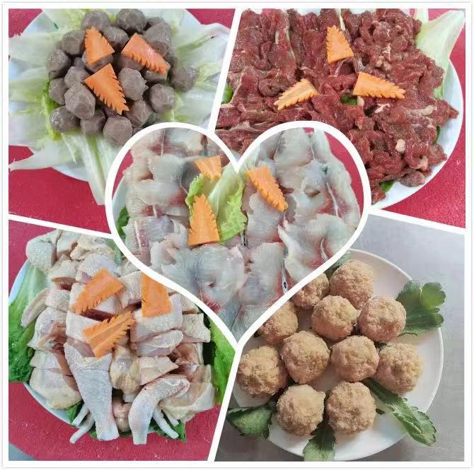 主要有牛肉片(丸)、鲜虾、清远鸡、鲩鱼片、鸭肉片,瘦肉片、鲜肚片,鲜尤鱼等。