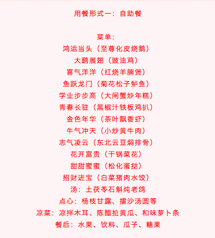 广东工业大学各校区值班食堂年夜饭的菜单也已陆续出炉,有自助餐、套餐、围餐、DIY等多种形式,人均不少于50元,对留校学生全部免费。