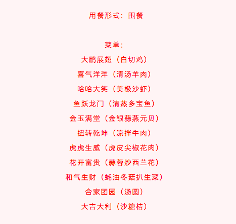 主要有蚝油牛肉片、狮子头、酥炸鸡腿、椒盐虾、姜葱焗鸡、碧绿鲜尤、果汁鸡扒、茄汁鱼片、土豆红烧肉、各类时令蔬菜,并配有水果。