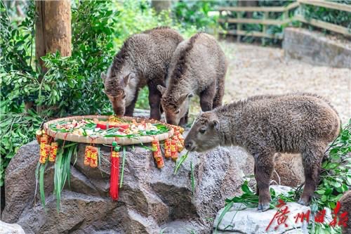 金毛羚牛是我国的一级保护动物,与大熊猫、金丝猴、朱鹮齐名的秦岭四大国宝动物。广州日报全媒体记者看到,金毛羚牛幼崽目前在长隆野生动物世界动物幼儿园生活着,健康状况良好。去年年底至今,共有13头金毛羚牛幼崽出生,出生时通体呈灰棕色,该颜色是与羚牛栖息地环境相适应的,是物种进化选择的结果。现在它们体重平均在8.6公斤以上,头上虽还没有长出成年羚牛标志性的“牛角”,但“铜铃”般的大眼睛和时刻竖起的小耳朵,颈及颌下垂顺着“短胡须”非常讨喜。