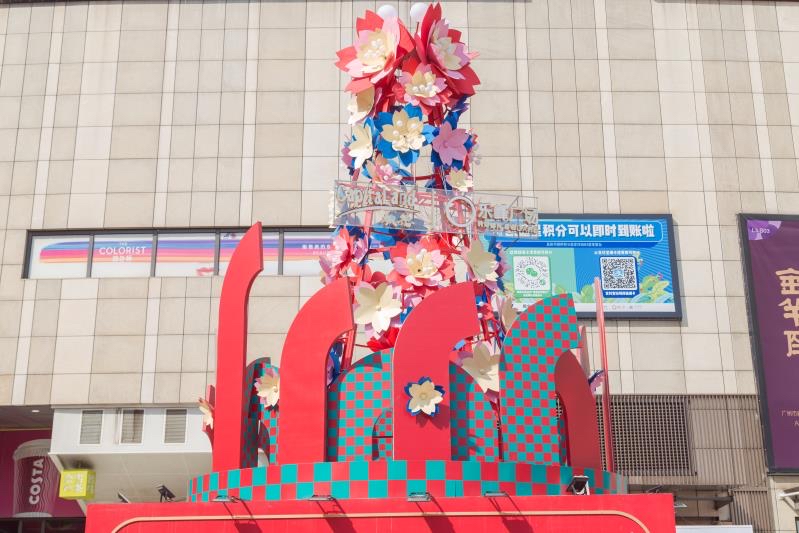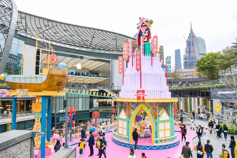在天环广场的花园平台,13米高的新春幸运塔楼成为了整条天河路最大亮点,塔尖的岭南特色喜萌醒狮和一身潮服的萌娃抢眼,粤式新春热闹气氛瞬间点燃。