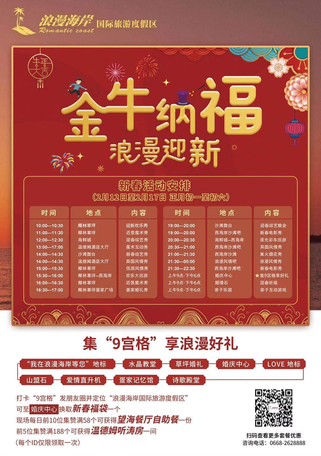 新春着数:浪漫海岸在春节推出了系列的度假套餐。其中,全包套餐含茂名浪漫海岸温德姆酒店1晚,双人景区大门票、望海餐厅自助早餐2份、自助晚餐2份、单次望海温泉票2张,价格从1014元起;春节乐享套餐含茂名浪漫海岸度假酒店1晚,双人景区大门票,双人海鲜城中式早餐2份,单次望海温泉门票2张,价格从550元起。