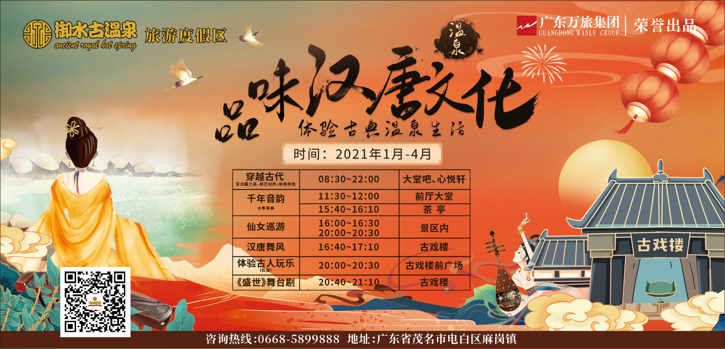 国潮春节:非遗过牛年,民俗闹新春。汉服作为华夏五千年文明中的一颗璀璨明珠,随着历史的发展,人们越来越意识到汉服之美,汉服重现生机。你是否也想体验一把衣袂飘飘的风韵? 春节黄金周期间,一场传统与时尚、古典与现代完美交融的古装秀将在茂名御水古温泉华丽绽放。