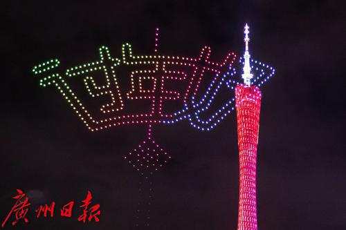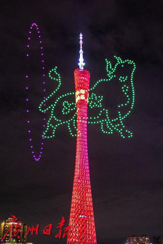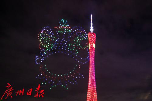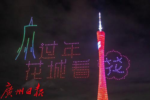 无人机编队摆出“过年好”的图案。第五组造型是一个红包飞出“恭喜发财”四个金色大字,用这句广州味道浓郁的拜年祝福语祝全国人民财源广进好运来。第六组造型是“广州过年 花城看花”的艺术字样,今年春节是广州这一城市品牌节庆活动的第八次上演。