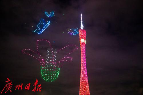无人机编队摆出“南狮狮头笑迎春”的图案。第三组造型是广州市市花——木棉花开,随着花瓣舒展,花蕊上空引来了三只彩蝶。