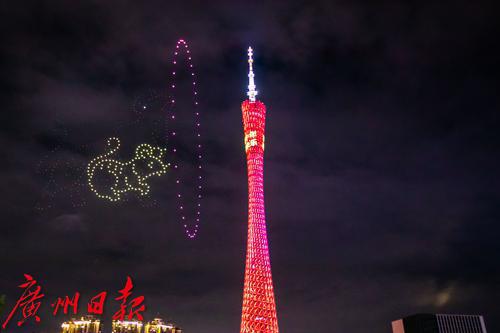 无人机编队摆出“广州过年,花城看花”的图案。无人机表演以夜空作画布,也与一旁的广州塔相呼应。“辛丑牛年 新春快乐”、“惟愿山河锦绣 国泰民安”、“惟愿和顺致祥 幸福美满”、“花城有爱 在穗过年”、“在广东过年挺好 N种方式过大年”公益广告在表演过程中一直在塔身上滚动播放。