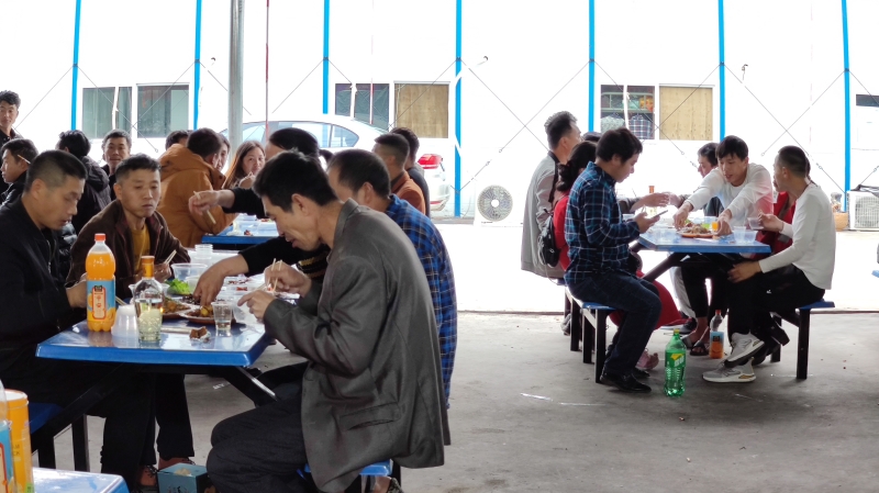 2021年除夕下午5时,中建三局在穗某项目工人聚在工地食堂,一齐吃了一顿特别的年夜饭。
