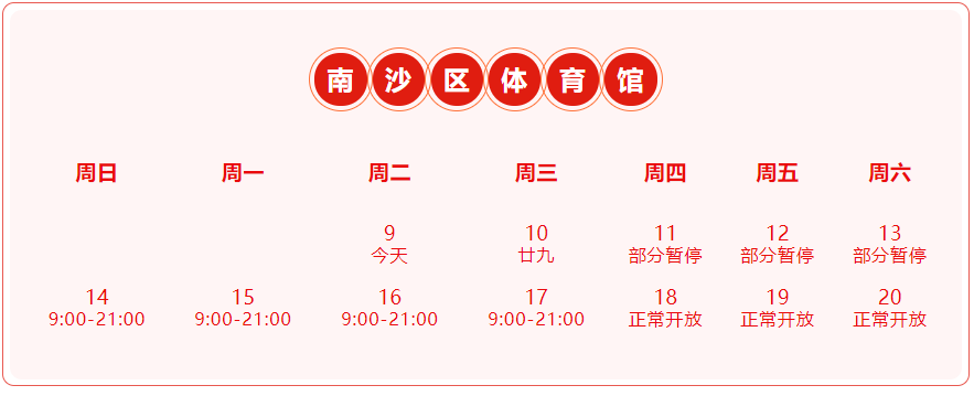 此外,2月11日至17日期间,体育馆免费惠民项目正常开放,进场需要到前台服务现场登记进场。羽毛球1-10号场地及乒乓球1-2号场地均每日9:00-12:00开放。