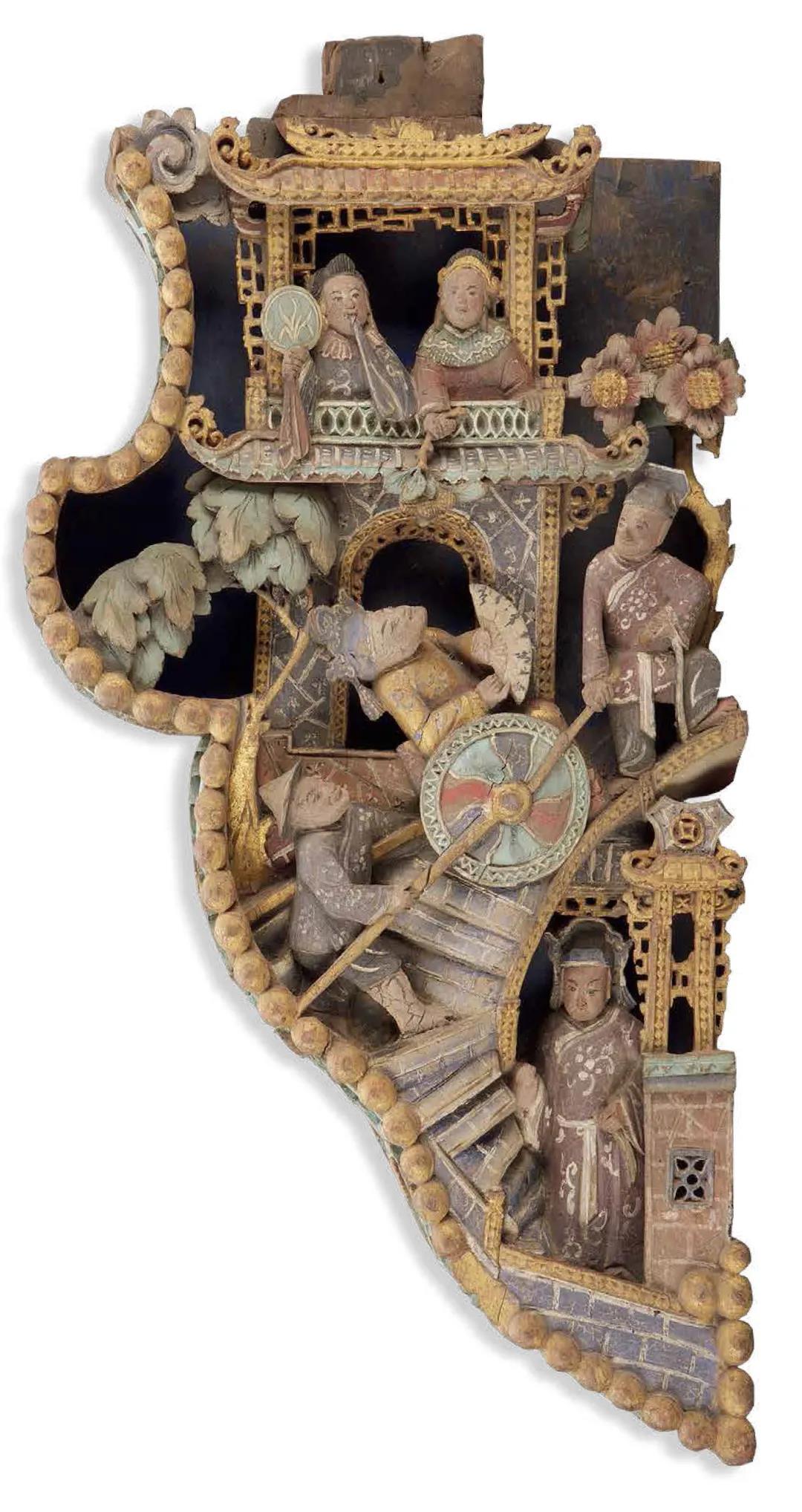 此彩绘木雀替来自广东潮汕地区,浮雕《荔镜记》中的五娘投荔等场景。