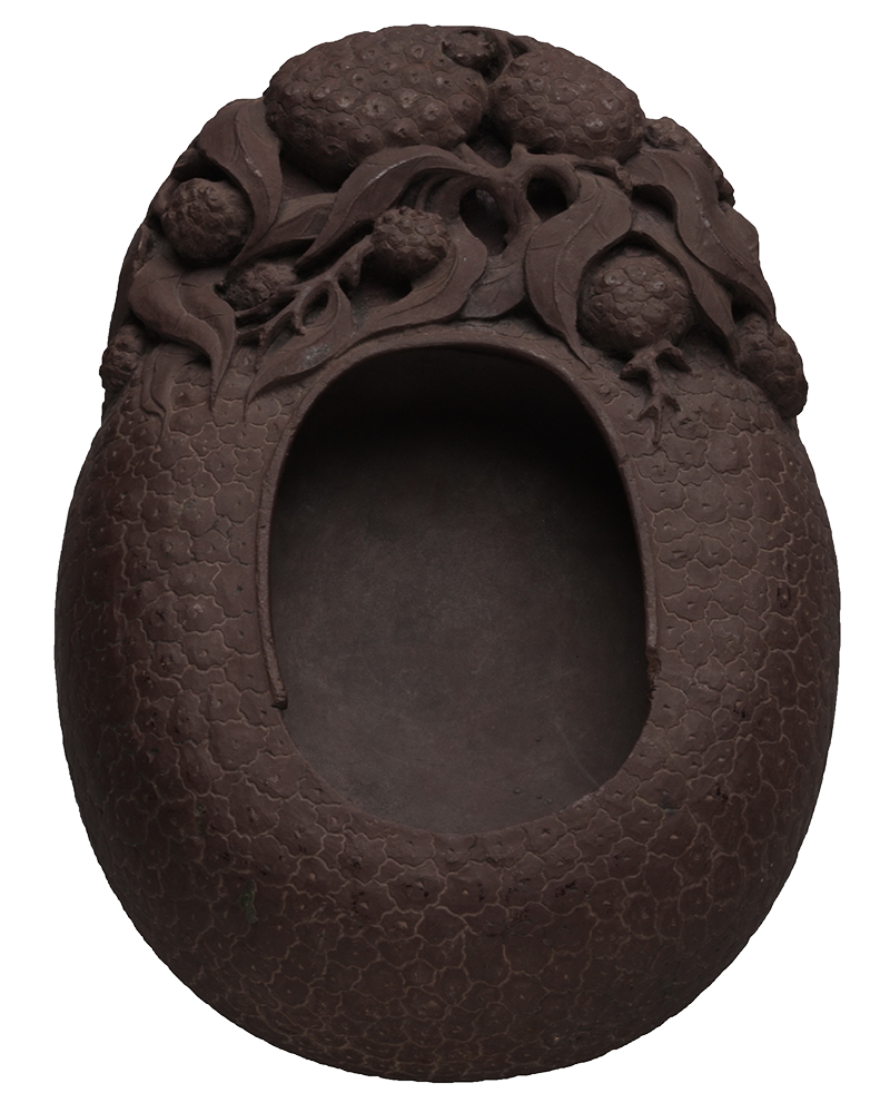 砚台雕成荔枝形。一面砚堂浅平,上部两侧各雕一蝙蝠,作双蝠临池状;砚额雕一串带叶荔枝及荔枝池。另一面砚堂为池状,砚额雕荔枝。整个砚身遍布荔枝纹路。构思奇巧,造型逼真,雕刻细腻。