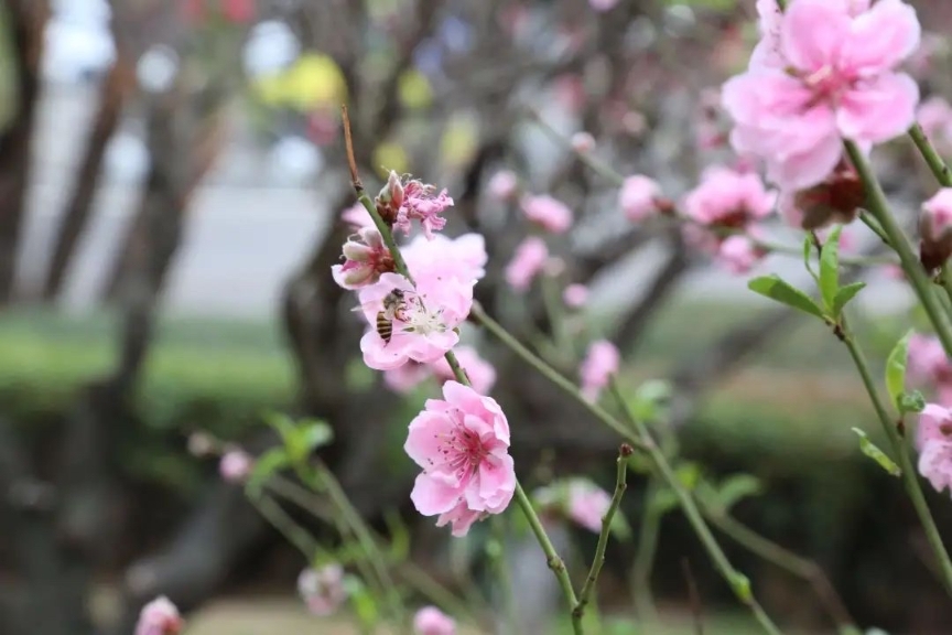 深入桃花园,处处是烂漫的桃花。蟠桃、白碧、绯桃、茶盅脚、蜜卵、寿带、各个品种的桃花争奇斗艳,游客们也沉醉在这桃花园中,或细嗅花香、或花前留影。