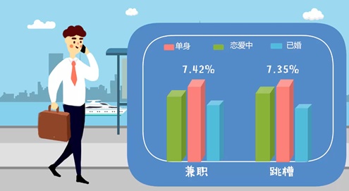 恋爱中的人们怎么样呢?在没有彻底搞定未来另一半的时候,可就要加把劲了。他们在过去一年选择兼职或跳槽的人,占比不小。看来爱情的甜蜜已经成功转化成工作的动力,希望别变成生活的压力才好。