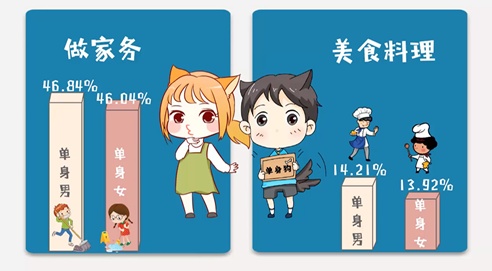 潇洒的单身一族在干啥呢?这个我们就要重点从单身男女日常休闲的不同说起。大调查发现,单身男生的休闲时间主要用来做家务、网购、健身和美食料理,而单身女生则更喜欢手机娱乐、看电视、看书学习和美容养生。划重点,单身男性比单身女性更喜欢做家务和美食料理。