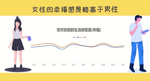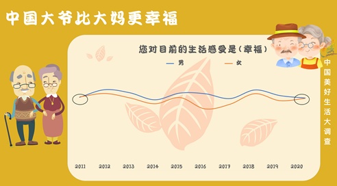 有意思的是,大爷和大妈的幸福感差距走进了十年一次的“相遇点”。2020年大爷(46.89%)大妈(46.47%)的幸福感差距接近十年前的那个交点。