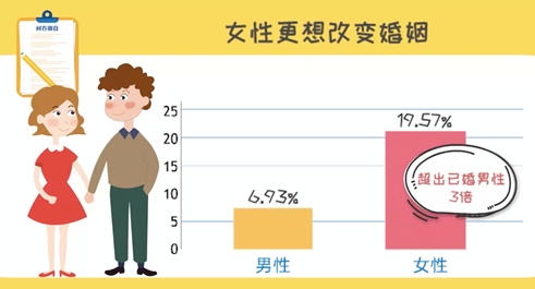 大调查今年还有个惊人的发现,当我们问受访者“如果有机会选择,你会选择改变什么?”时,在已婚群体中,女性想要改变婚姻的远远高于男性,超出已婚男性三倍之多,并且每个年龄段都要高出男性2倍以上。