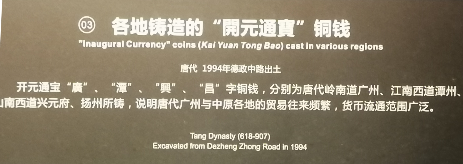 广州博物馆的主体陈列中展示了新翼广场工地出土的“开元通宝”,在背景说明中指出“唐代广州有专门的铸币机构与场所”,并在同类器物的对比展示说明文字中指出“开元通宝‘廣’‘潭’‘興’‘昌’字铜钱,分别为唐代岭南道广州、江南西道潭州、山南西道兴元府、扬州所铸,说明唐代广州与中原各地的贸易往来频繁,货币流通范围广泛。”
