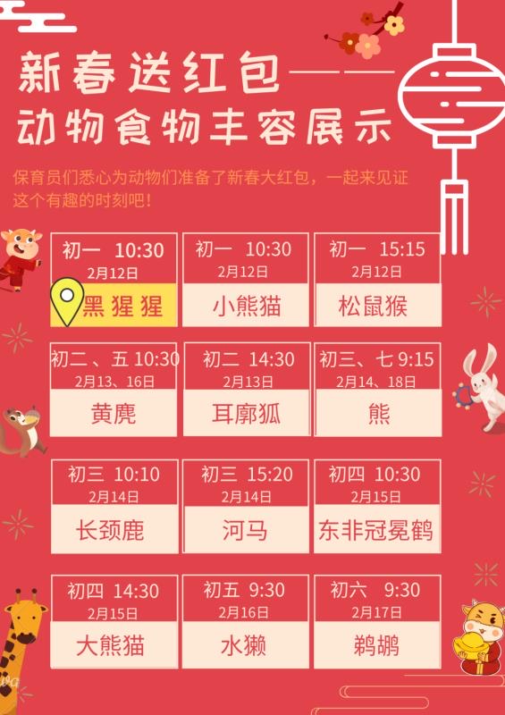 2月12-14日,广州动物园的工作人员将戴着动物头套巡游,结合派祝福红包、宣传文明游园、与游客合影等互动,营造欢乐节日气氛。“动物们”集体出访园内巡游派新年红包,一起来跟他们有个奇妙的偶遇,难忘的合影吧!