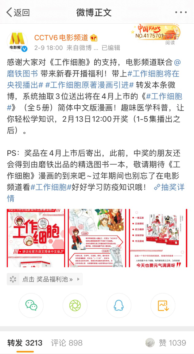 近日,日本科普动画《工作细胞》央视开播,磨铁图书也引进出版了《工作细胞》(1-5册)简体中文版漫画。此前,央视电影频道官方微博@CCTV6电影频道与图书出版品牌@磨铁图书发起了图书抽奖活动。