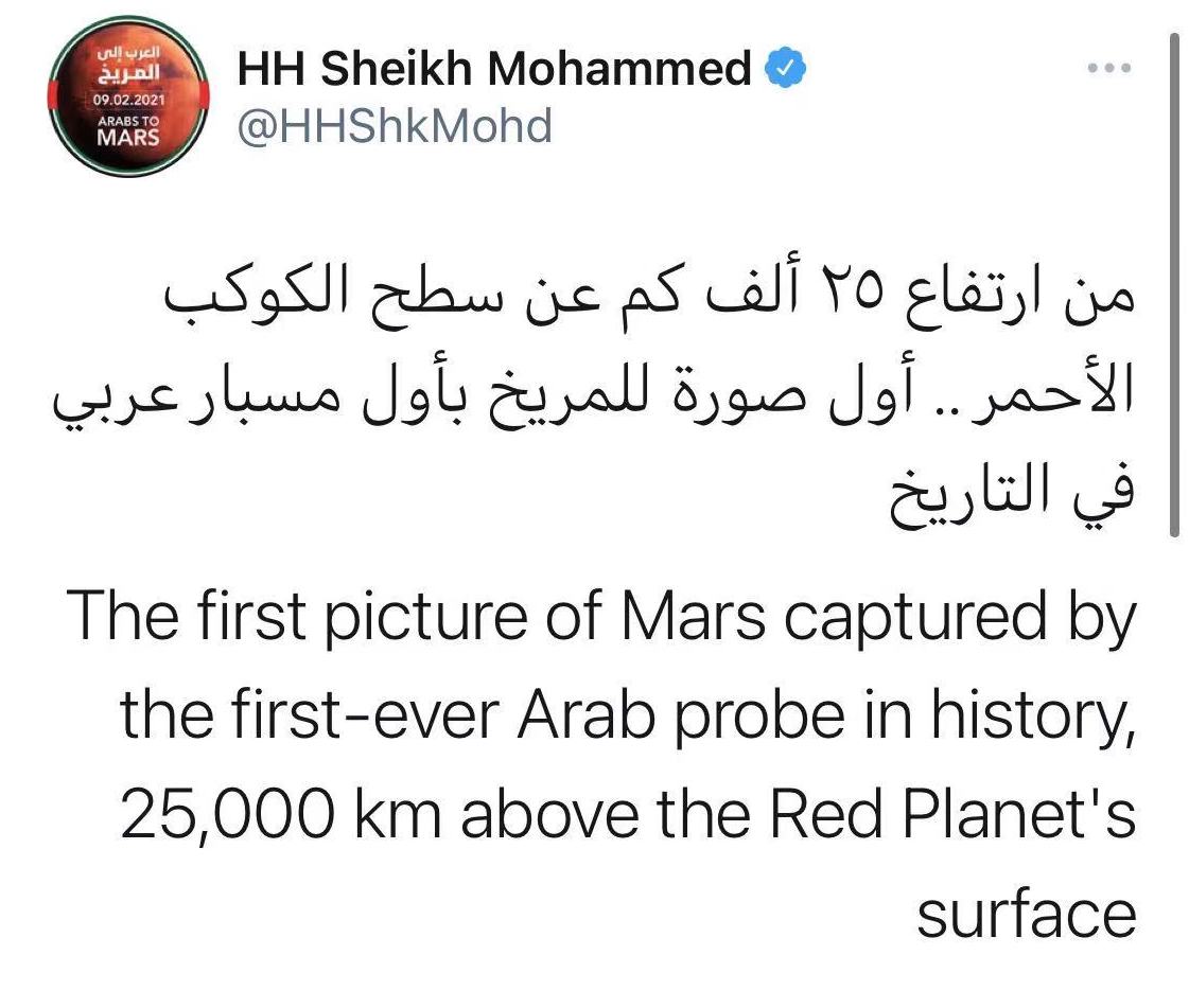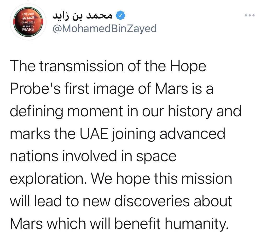 总统阿勒纳哈扬发文称:“希望探测器传输的第一张火星图像是我们历史上的一个决定性时刻,标志着阿联酋加入了参与太空探索的先进国家行列”。