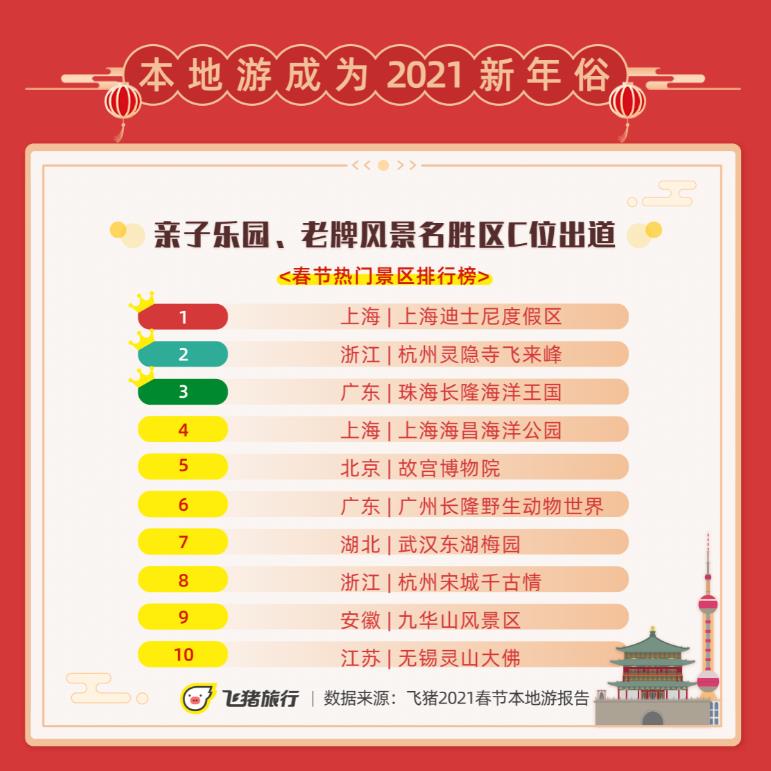 景区方面,主题乐园和祈福许愿胜地受热捧。不论是亲子家庭喜欢的上海迪士尼度假区、珠海长隆海洋王国、上海海昌海洋公园、广州长隆野生动物世界,还是老牌风景名胜区灵隐寺飞来峰、故宫博物院、九华山、灵山大佛等,均位列春节热门景区前十。全国近80家景区支持飞猪App扫码购票免费领口罩。