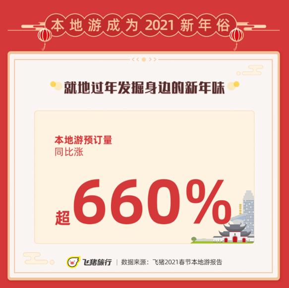 牛年春节,“原年人”就地发掘新年味,本地游成为新年俗。飞猪数据显示,春节期间低风险地区的本地游需求较为旺盛,预订量同比涨超660%,玩酒店、逛景区和“云旅游”成为春节热选。飞猪直播观看人次同比增长近1000%,酒店餐饮预订人次涨超2800%。