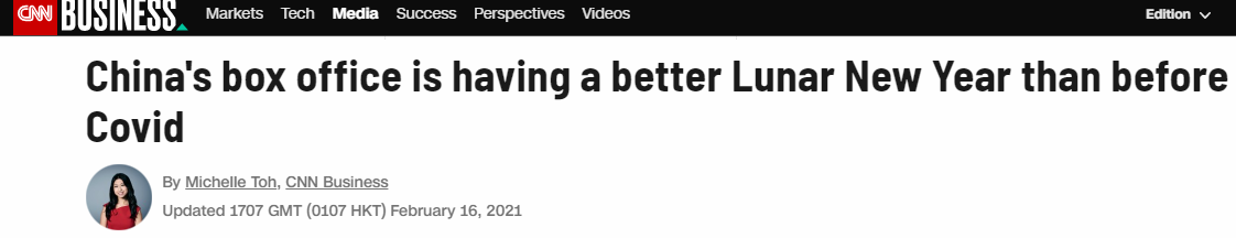 美国有线电视新闻网(CNN)发表的一篇文章指出,尽管电影院观影人数受到一些限制,但中国春节假期的电影票房收入超过了2019年同期。