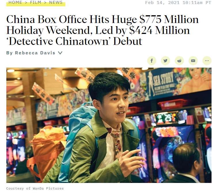 美国《综艺》(Variety)杂志报道,中国在上周末创造了历史,春节假期前三天的票房收入达到创纪录的7.75亿美元(约合人民币50亿元),其中《唐人街探案3》的首次亮相令人难以置信地达到4.24亿美元(约合人民币27.4亿元)。