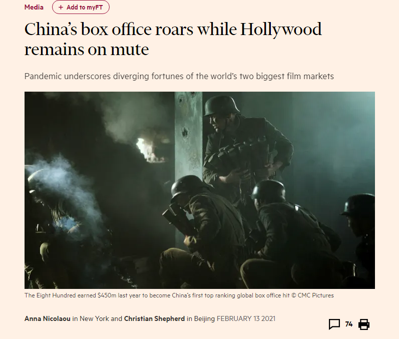 英国《金融时报》发表题为《当中国票房大热时,好莱坞仍在沉默》的文章指出,在春节假期期间,中国的票房大热,而在北美的大多数电影院仍在关闭,这凸显了世界上两个最大的电影市场的命运。