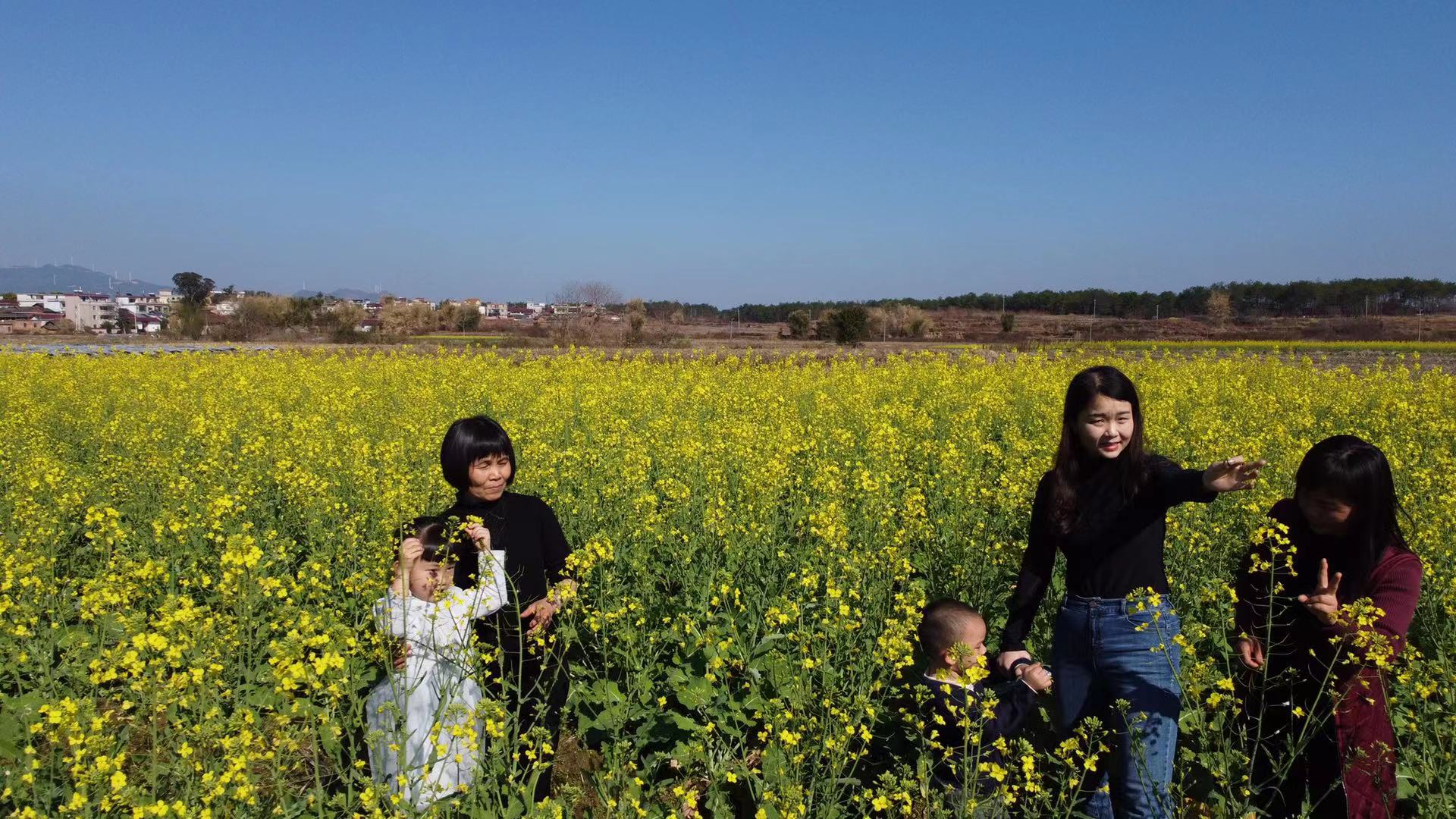 “我们一家人是过来走访亲戚的,路途上看见成片成片金黄色的油菜花田就忍不住和家人一起到花丛中拍上一张合照发朋友圈......就地过年,就地看花,这个年过的有朝气。”张雅淇一家子跑到油菜花田拍照合影,虽然脚上、手上、衣服上都沾满了泥土,但丝毫不影响他们游玩的心情。