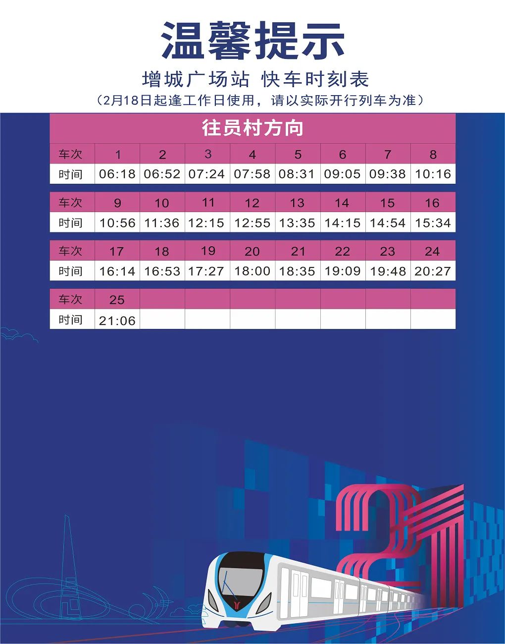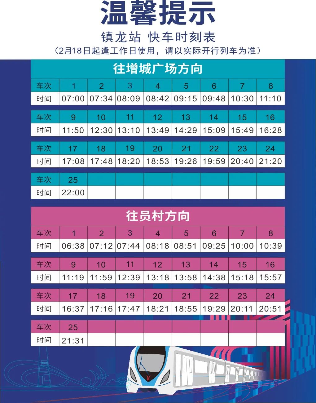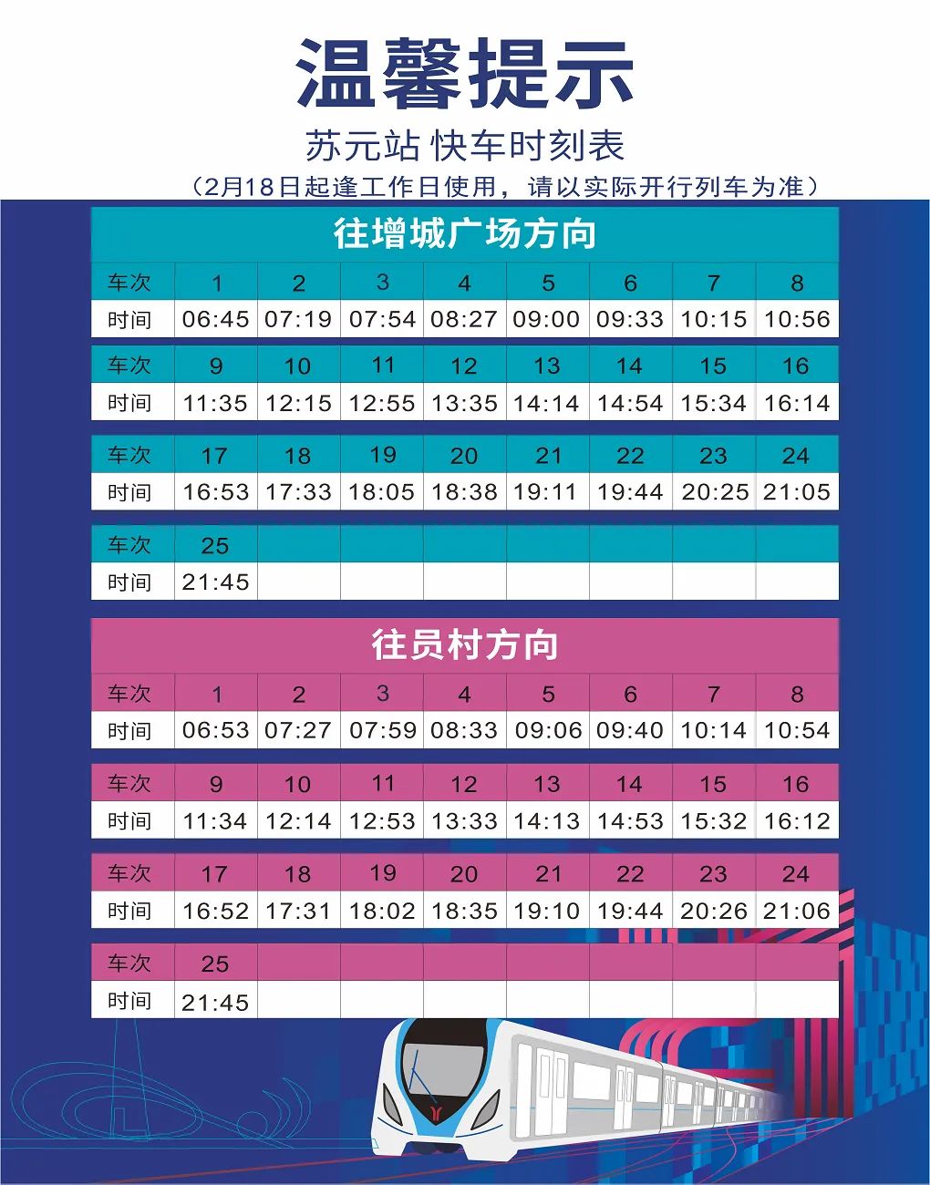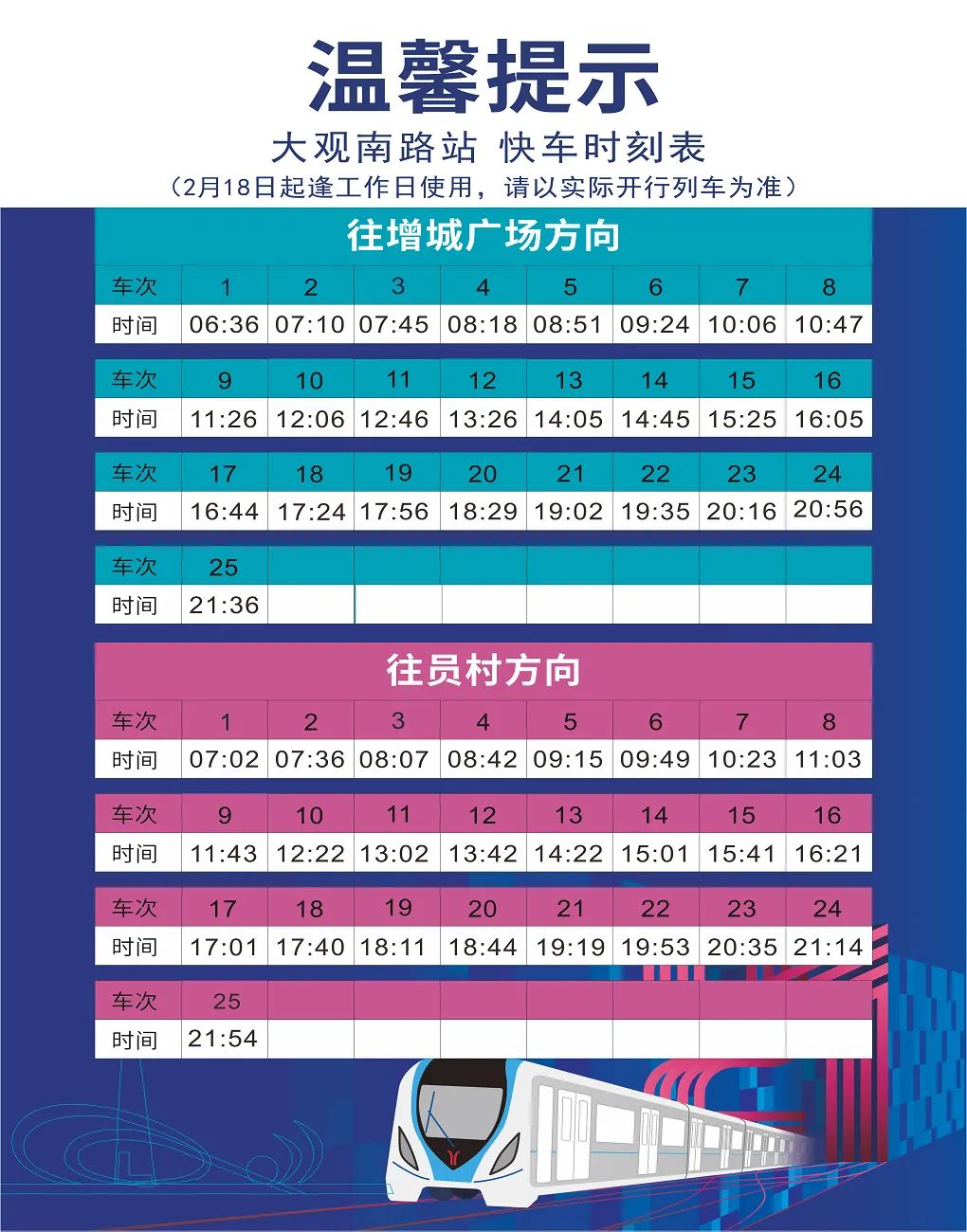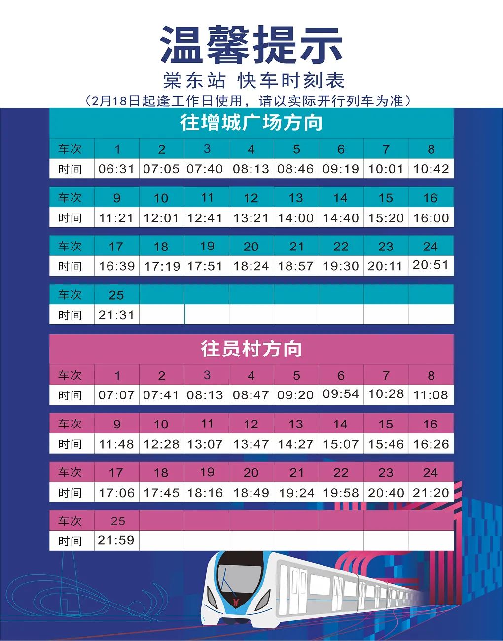 新的快车时刻表仍分为工作日和周六、日两个版本,快车实际到站时间会根据列车运行情况和客流情况有所调整,此时刻表仅作为参考,搭乘时请以现场为准。2月20日是春节假期调休,所以2月20日(周六)也是使用工作日的快车时刻表。