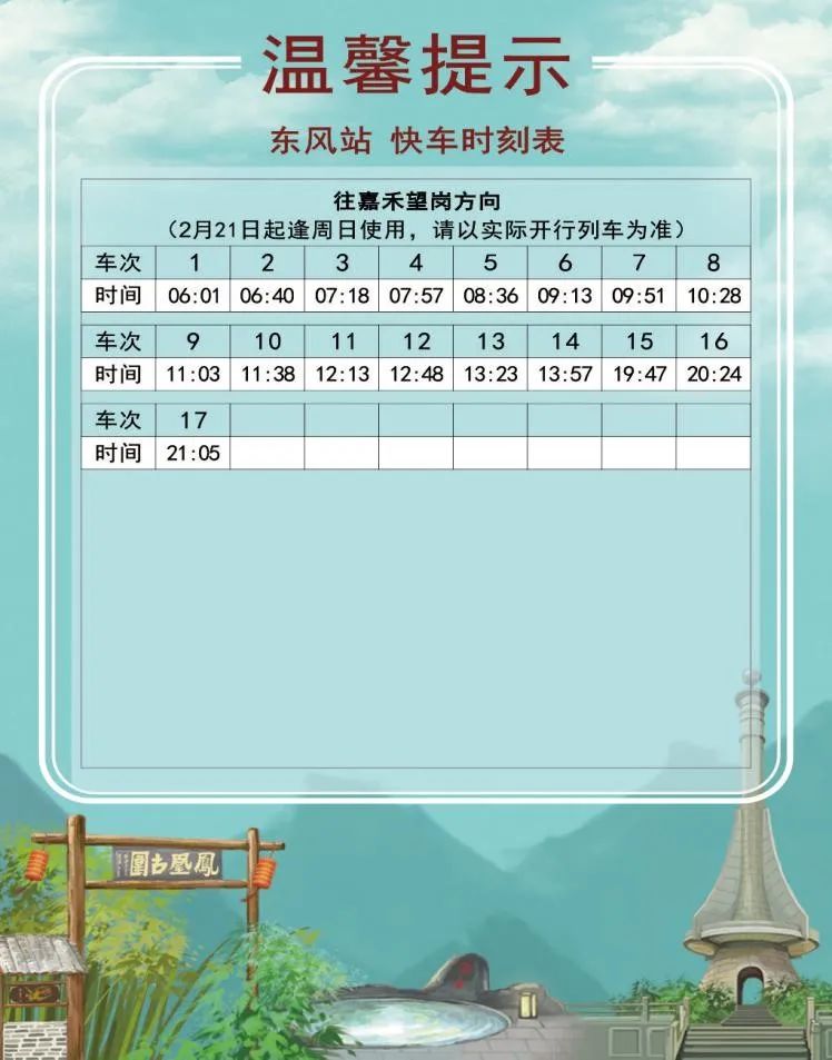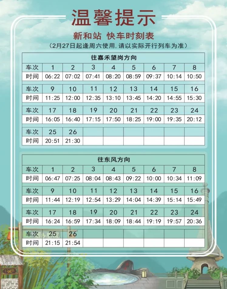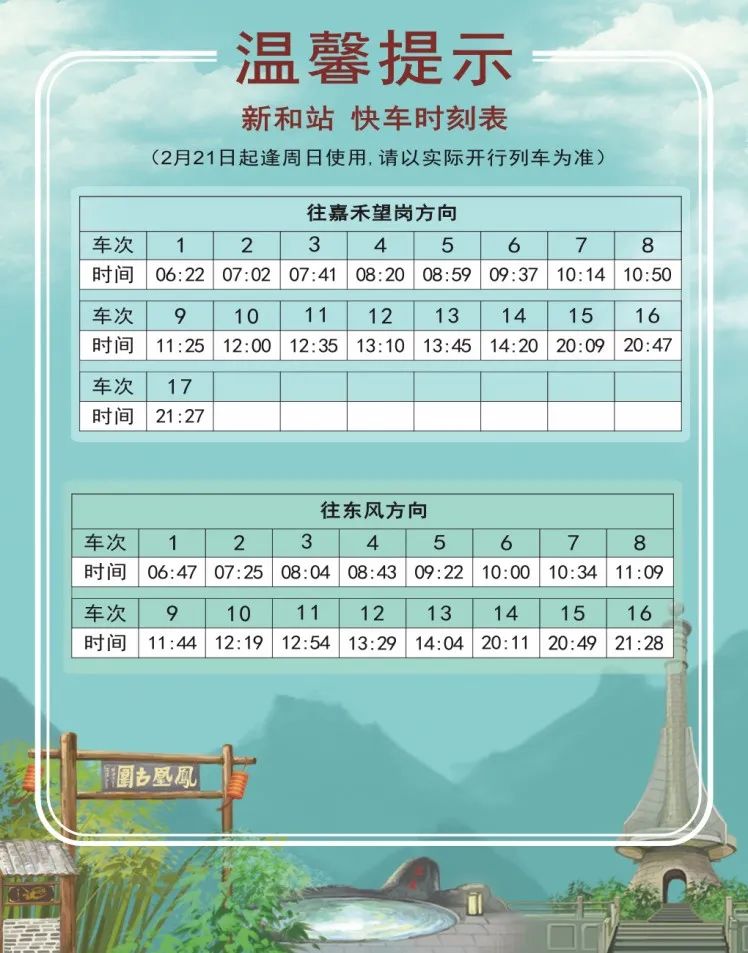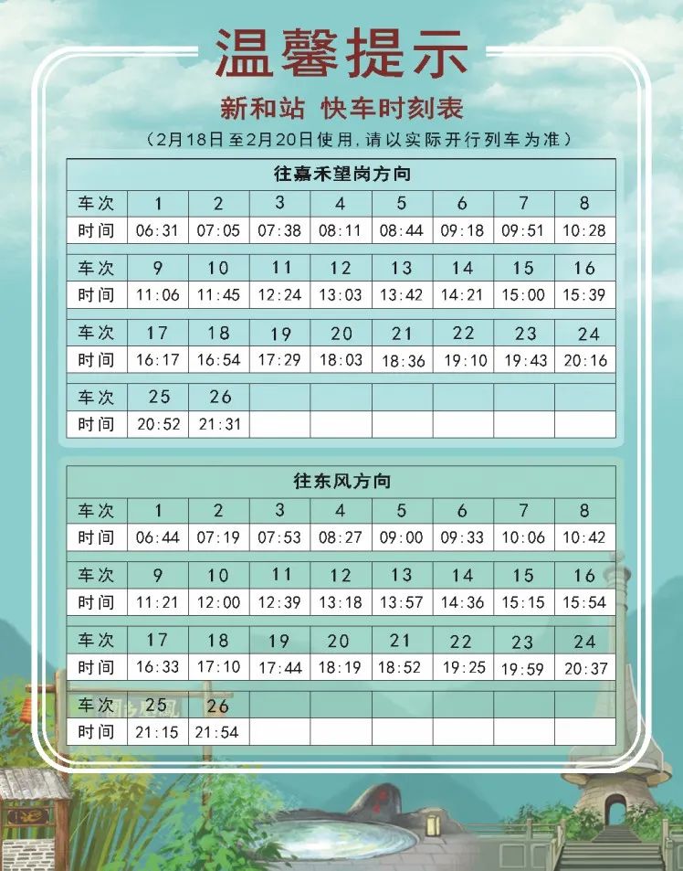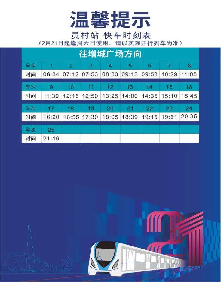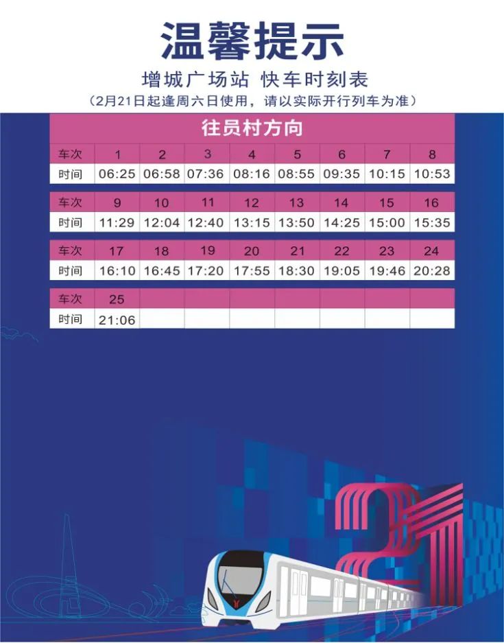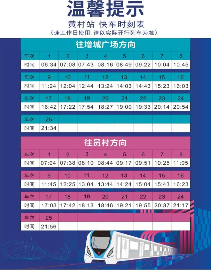 新的快车时刻表仍分为工作日和周六、日两个版本,快车实际到站时间会根据列车运行情况和客流情况有所调整,此时刻表仅作为参考,搭乘时请以现场为准。2月20日是春节假期调休,所以2月20日(周六)也是使用工作日的快车时刻表。