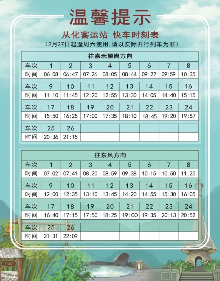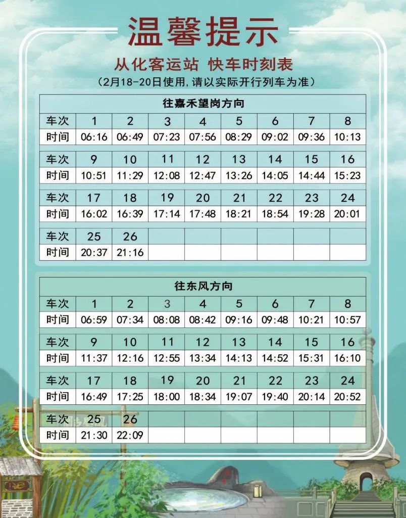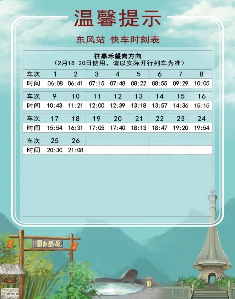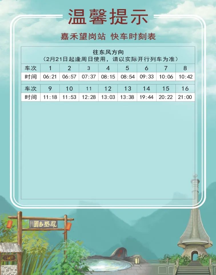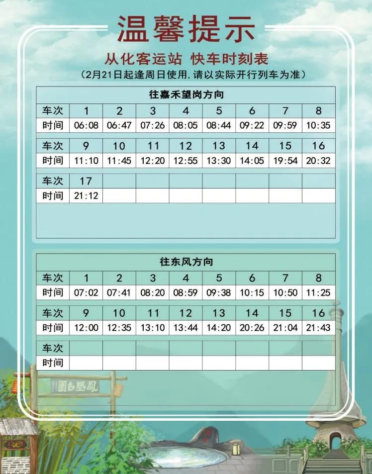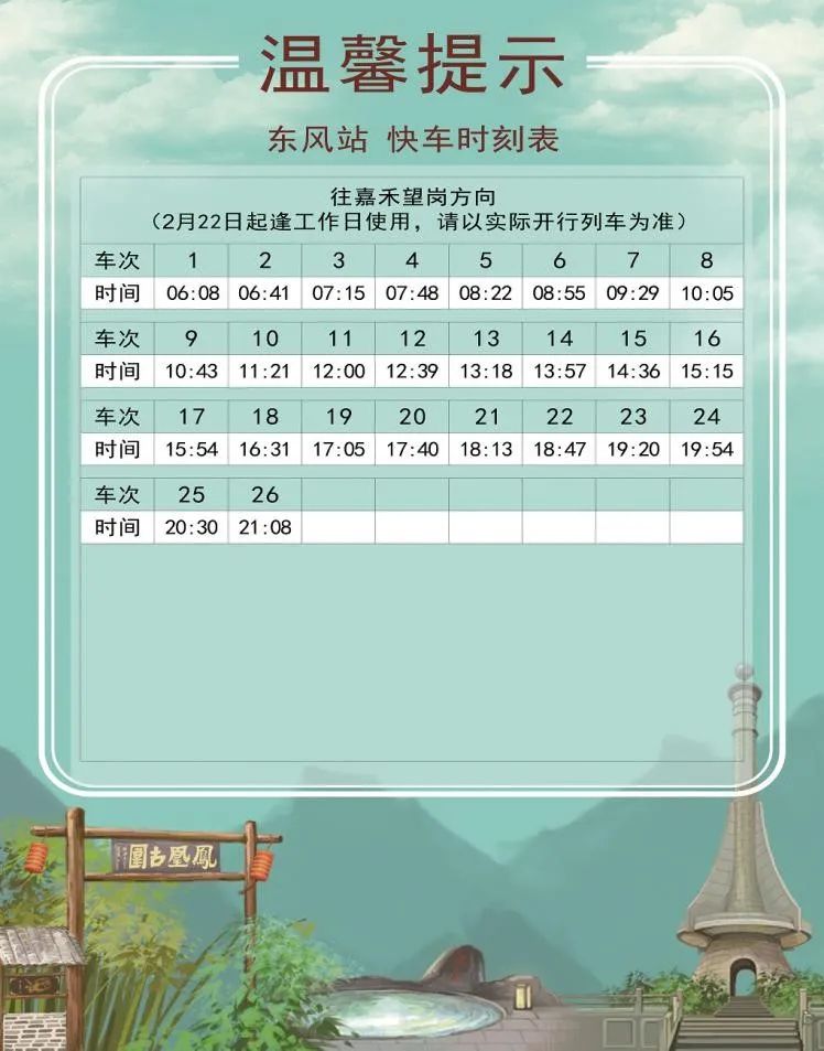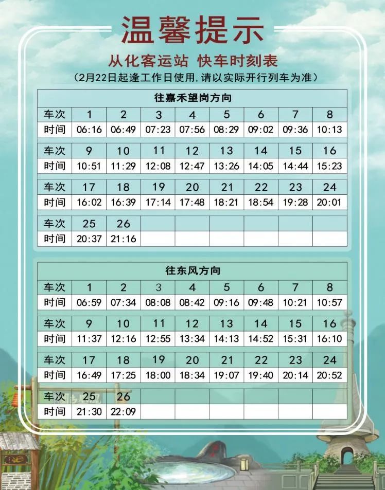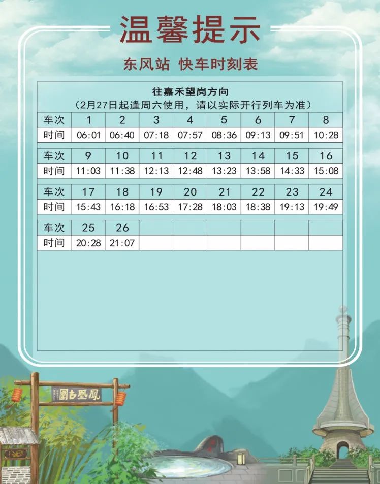 新的快车时刻表仍分为工作日和周六、日两个版本,快车实际到站时间会根据列车运行情况和客流情况有所调整,此时刻表仅作为参考,搭乘时请以现场为准。2月20日是春节假期调休,所以2月20日(周六)也是使用工作日的快车时刻表。